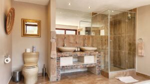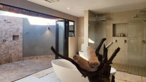 Each spacious thatched suite has its own modern en-suite bathroom which includes a double basin, enclosed shower, bath, toilet and private outdoor shower under the African skies.