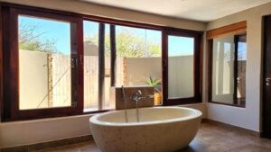 The lodge sleeps a maximum of 10 guests including children. Each spacious thatched suite has its own modern en-suite bathroom which includes a double basin, enclosed shower, bath, toilet and private outdoor shower under the African skies.